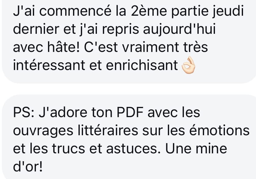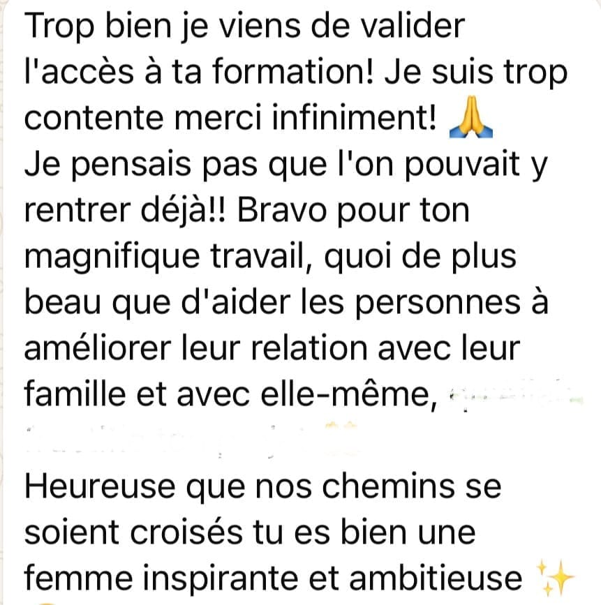 C'est tout à fait normal de ressentir des moments de doute ou d’intensité émotionnelle en suivant cette formation. Je t'encourage à prendre ton temps, à pratiquer les outils et à revenir sur les ressources au besoin. La formation est là pour t’accompagner à ton rythme, sans pression.