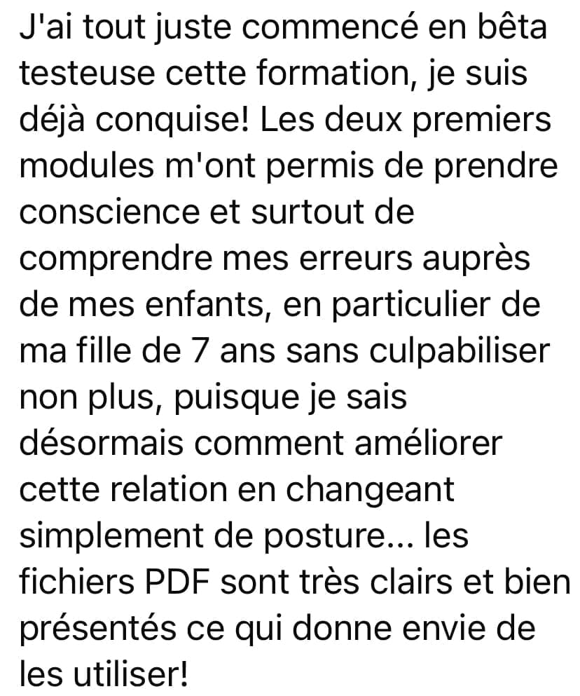 Tu attends des méthodes autoritaires ou punitives. Si tu cherches une formation pour apprendre à discipliner ton enfant par la peur ou la contrainte, ce programme ne répondra pas à ces attentes. Cette formation est fondée sur la douceur, la bienveillance et la coopération.